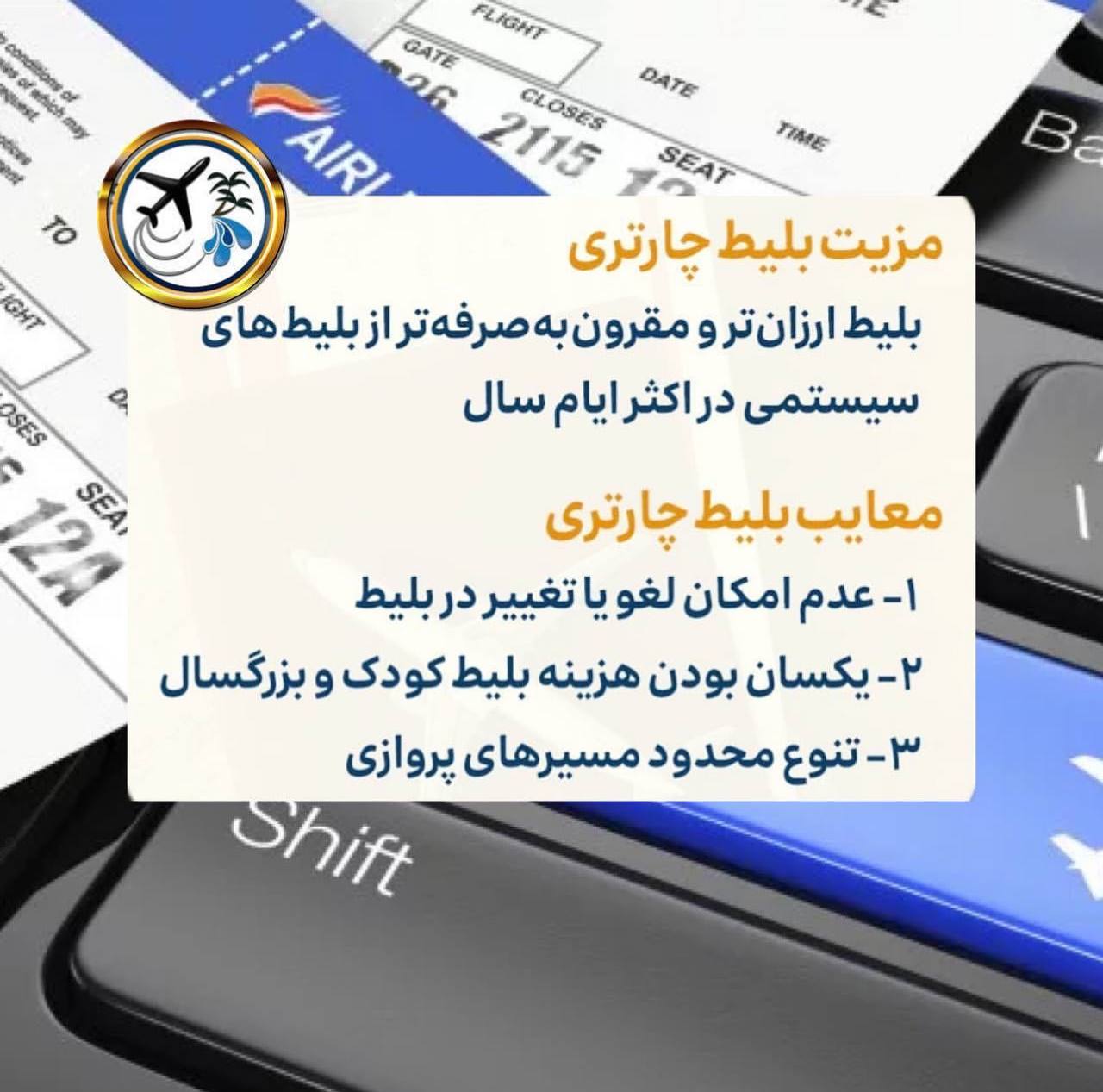 • بلیط های چارتر از لحاظ کیفیت هیچ تفاوتی با بلیط های سیستمی ندارند، تنها قیمت آنها کمتر است.
