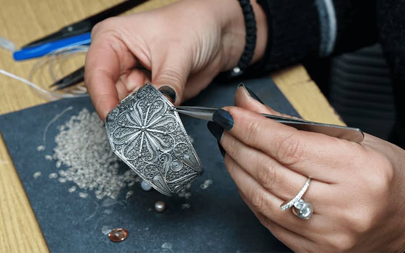 اشتهرت فضيات شيراز في هذا البلد منذ الماضي وتتضمن أنماطًا مثل النرجس والزنبق وخمسة ريش والعنبر والورد ، والتي لن تجدها في أي ركن من أركان إيران. كما تظهر بين الأعمال الفنية تصميمات أخرى مثل نقش فوروهار وأساطير الشاهنامه والملوك الأخمينيين وليلي ومجنون وما إلى ذلك. يستخدم هذا الفن في تحضير أطقم الشاي والمزهريات والشمعدانات والحلي والإكسسوارات الزخرفية. الصياغة هي فرع من فن تشغيل المعادن يتم من المعدن الفضي وتشكيله. الأعمال الفضية في شيراز لها درجة أعلى من 90 ، وبالتالي فإن سعرها أعلى من الأعمال الفنية المماثلة في المحافظات الأخرى.