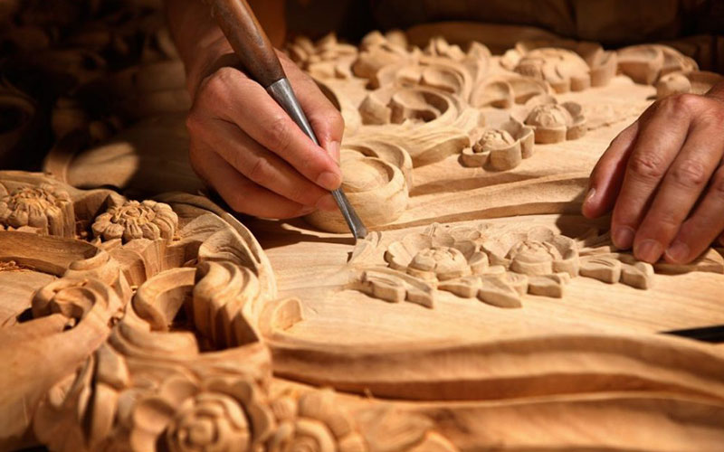 يتم النحت بالخشب باستخدام مواد بسيطة مثل أقلام قليلة وإزميل معدني ، ويمكن رؤيته من الخطوط الكوفية وزخارف السلي إلى زخارف Khatai والزهور والطيور. يوجد حاليًا العديد من ورش التطعيم في مدينة شيراز ، من بين أعمال التطعيم ، يعد ترصيع رقعة الشطرنج أكثر إثارة للاهتمام ، وبما أنه يجب استخدام مواد مثل عاج الفيل وعظام الجمل في مستطيلات السبورة ، فمن الممكن القيام بذلك. أكثر من سنة إلى سنتين.
