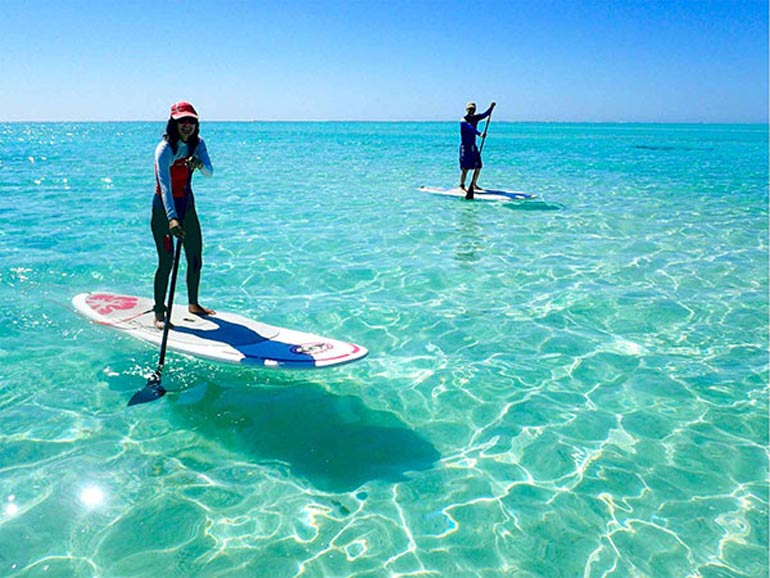 في هذا المرح ، تقف على الألواح الكبيرة وتتحرك على الماء باستخدام مجاديف خاصة. أهم جزء في التجديف هو الحفاظ على التوازن على اللوح. قليل من الناس يمكنهم الحفاظ على توازنهم جيدًا على لوح مجداف.