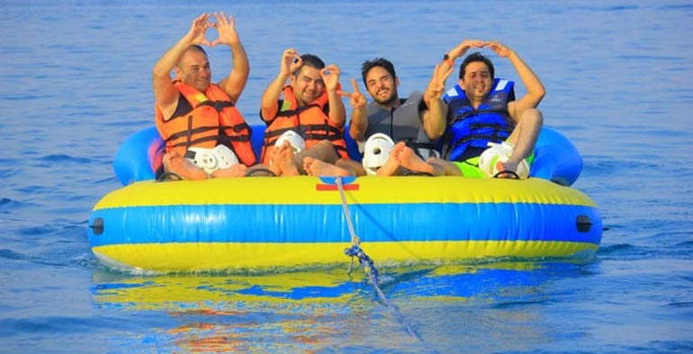 ركوب الموز مثل ركوب المكوك ؛ بالطبع ، هناك فرق بسيط بين هاتين المرحلتين. في المكوك ، تجلس في قارب أنبوبي وأنت داخل القارب تمامًا ؛ لكن في الموز ، تجلس على أنبوب على شكل موزة وتكون قدميك في البحر. مدة استخدام الموز مع كل تذكرة حوالي 15 إلى 20 دقيقة.
