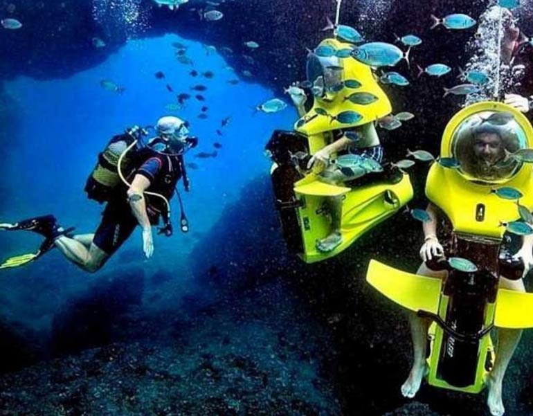 سكوتر تحت الماء ، بكلمات بسيطة ، هو الغوص الحديث. في هذا المرح ، ستركب دراجة بخارية وتذهب مسافة 10 أمتار تحت سطح البحر. لست بحاجة إلى معرفة كيفية السباحة ، فالمدربون المحترفون معك ويساعدونك في مرافق آمنة. لتجربة سكوتر الغواصة ، عليك الذهاب إلى مدينة ملاهي كيش بين الساعة 10:00 صباحًا والساعة 5:00 مساءً.