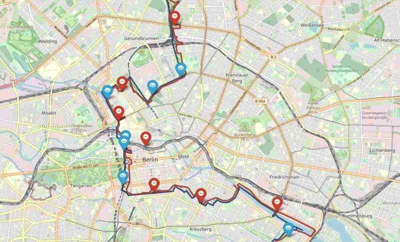 Pavement of the Berlin Wall in the city: To show the exact location of the Berlin Wall, a continuous pavement has been stretched in two rows all over the city. Some parts of this cobblestone are accompanied by a copper plate with the following words on it: