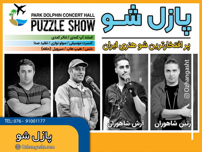 محل اجرای برنامه ، کنسرت هال پارک دلفین ها است.*این شو با حضور اكبر اقبالى ، آرش شاهوران و به تهیه کنندگی و کارگردانی آرتین شاهوران و عسل افشاری هر شب اجرا مى شود .*اين برنامه با ١١ سال سابقه درخشان و حضور هنرمندان صاحب نام در رده پر افتخارترين برنامه های هنری كشور قرار دارد.*در روزهای معمولی این جنگ جذاب در یک سانس ۳ ساعته اجرا دارد.*پازل شو هیچ گونه مسئولیتی در قبال وعده های شفاهی و کتبی فروشندگان و قول شماره صندلی و ردیف ندارد.*شماره پشتیبانی:۰۷۶۹۱۰۰۱۱۷۷.