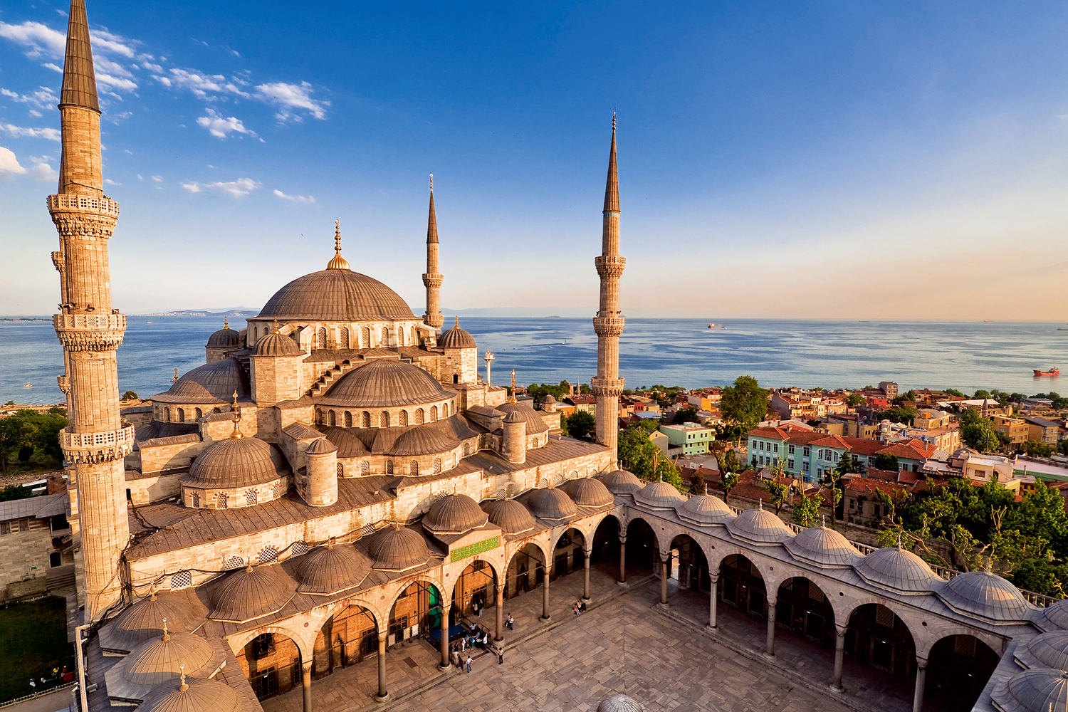 مسجد آبی با گنبدهای آبشاری، تقارن دقیق و طاقهای پی در پی، منارهها و کاشیهای آبی درون مسجد نقطه اوج معماری عثمانی به شمار میآید