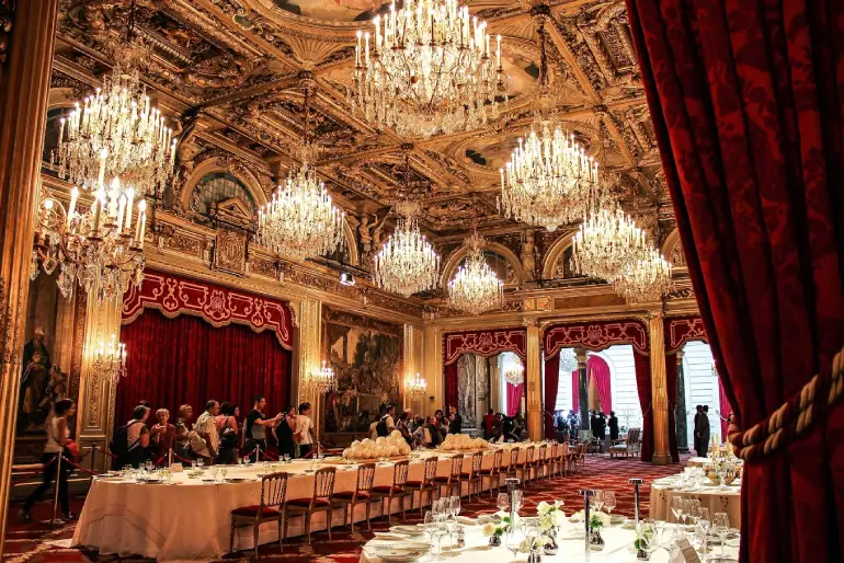 همانطور که گفتیم، کاخ الیزه پاریس به سبک کلاسیک فرانسوی ساخته شده است. هنگامی که وارد کاخ میشوید، توجهتان به نقشونگارهای طلاییرنگ برجسته جلب میشود که سراسر دیوارهای کاخ را پوشانده است و در کنار پردههای مخمل قرمز، لوسترهای گرانقیمت، مبلامان گرانبها و چیدمان شیک، جلوهای تماشایی دارد.