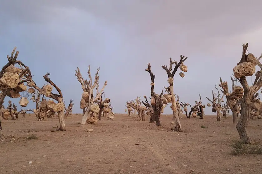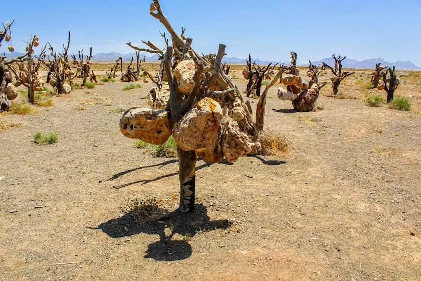 سنگ های درشتی که به عنوان میوه از شاخساران این باغ خشک آویزان شده است به وسیله کابل هایی که درویش خان از سوزاندن لاستیک های فرسوده خودرو ها و خارج کردن سیم های مفتول درون آن ها را فراهم کرده بود.بر جای خود مستقر میشدند.سوراخ های اعجاب انگیزی که درویش خان با کمک ابزار های دستی در سنگ ها پدید آورده خود به موضوع جالبی در نزد بازدید کنندگان از این باغ بدل شده است.