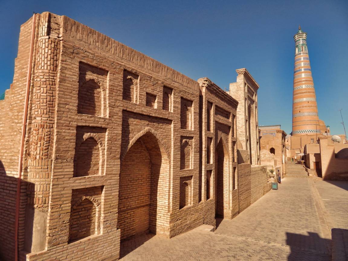 در 600 کیلومتری شمال بخارا در کشور ازبکستان شهری تاریخی به نام خیوه قرار دارد که روزگاری مرکز سرزمین خوارزم بود و یشینه آن را به سده شش میلادی نسبت داده اند.در این شهر تاریخی مجموعه ای از بناهای تاریخی وجود دارد که با حصاری از گل و خشت در بر گرفته شده اند.این بناها که به سبک معماری اسلامی و ایرانی ساخته شده شامل دروازه ها .مسجد ها.مدرسه ها.آرامگاه ها .گرمابه ها .کاخ ها و خانه های سنتی است و عظمت و اهمیتشان به حدی است که در فهرست 10 بنای برتر خشتی جهان قرار گرفته اند.این شهر 50 اثر تاریخی و 250 خانه کهن دارد و به باور بسیاری از در زمره مکان هایی به شمار می آید که در اوستا از آن به تحت عنوان ایران ویچ سرزمین اصلی آریاییان یاد شده است .در باور عامه این مجموعه 2500 سال پیش توسط سام پسر نوح نبی (ع) ساخته شده است.