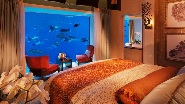 هتل آتلانتیس سوئیتهای خود را با نامهایی مانند نپتون و پوزیدون نام گذاری کرده و امکانات بسیار لوکس و خاصی به مهمانان خود ارائه میدهد. این اقامتگاه یکی از لوکسترین هتلهای زیر آب جهان است و بر روی جزیرهای به شکل نخل ساخته شده و به عنوان یکی از چشمگیرترین هتلهای دبی شناخته میشود. اتاقهای زیر آب در هتل آتلانتیس چشم اندازی رو به آکواریومی با 65000 آبزی از جمله کوسه دارد و وجود همین آکواریوم باعث شده این هتل در میان هتلهای زیر آب طرفداران زیادی داشته باشد. هزینهی اقامت در این هتل به ازای هر شب از 7000 دلار شروع میشود. از جمله امکانات این هتل میتوان به امکان سرو غذا در اتاق، 30 تمرین خصوصی بدنسازی، ترانسفر فرودگاهی رایگان اشاره کرد. مهمانان این هتل میتوانند در این آکواریوم بسیار بزرگ غواصی کنند و از نزدیک این حیوانات را ببینند.