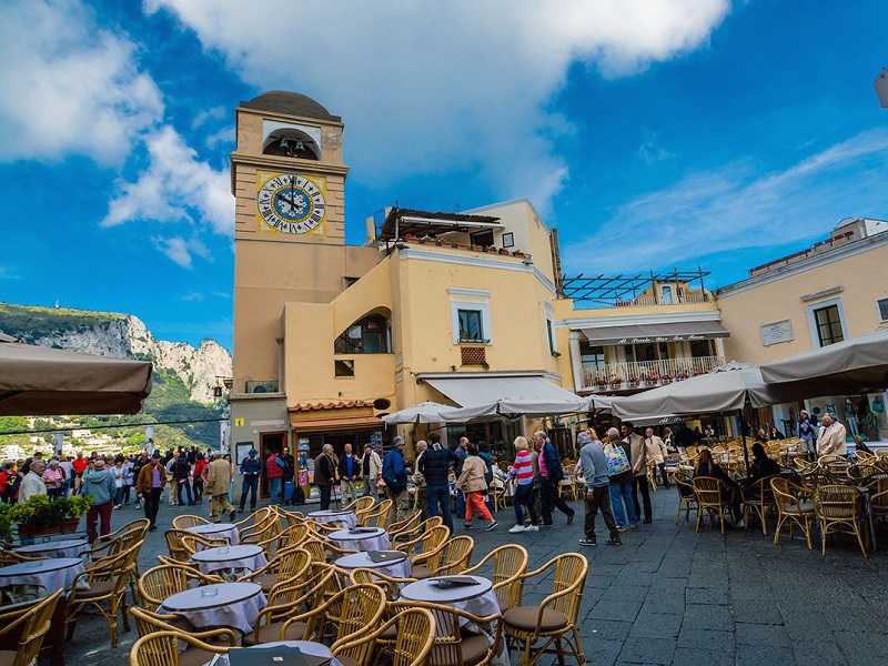 اگر از ساحل و چشم اندازهای ساحلی خسته شدید به مرکز شهر کاپری بروید، در این قسمت برای گذراندن بک عصر دلچسب هیچ جایی بهتر از زیباترین میدان شهر نیست! پیاتزا اومبرتو معروف ترین میدان شهر کاپری ست و در اطراف آن کافه های زیادی می بینید که جایی عالی برای نشستن و تماشای مردم است. عصرها تعداد زیادی از مردم در این میدان جمع می شوند تا چند ساعتی را در کافه ها بگذرانند و یا چشم اندازهای تاریخی اطراف را تماشا کنند. در چند قدمی این میدان برج ساعت بزرگی هست که قدمت آن به قرن ۱۷ برمی گردد.